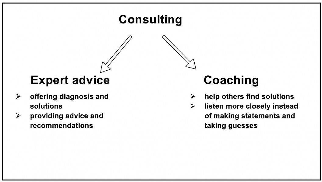 Apart from that, there is yet another kind of consultation – coaching –, and this is the one that requires a consultant as a helpful sparring partner. In this case, a consultant and his client meet as equal partners. The consultant tries to support his client by starting a type of dialogue and by creating the best possible solution for whatever the client wants. Consultants in this field mainly work by listening closely, asking questions, giving feedback or offering particular points of view and perspectives, which does not exclude that such a consultant might also formulate hints, recommendations, possible solutions and similar conclusions. In general, a coach will always spend more time listening and asking questions than diagnosing and giving advice. While the coach is formulating diagnosis and advice, it is almost always the consulter who decides what amount of importance he would like to give to particular addressed points and whether or not s/he wants to use the given advice.