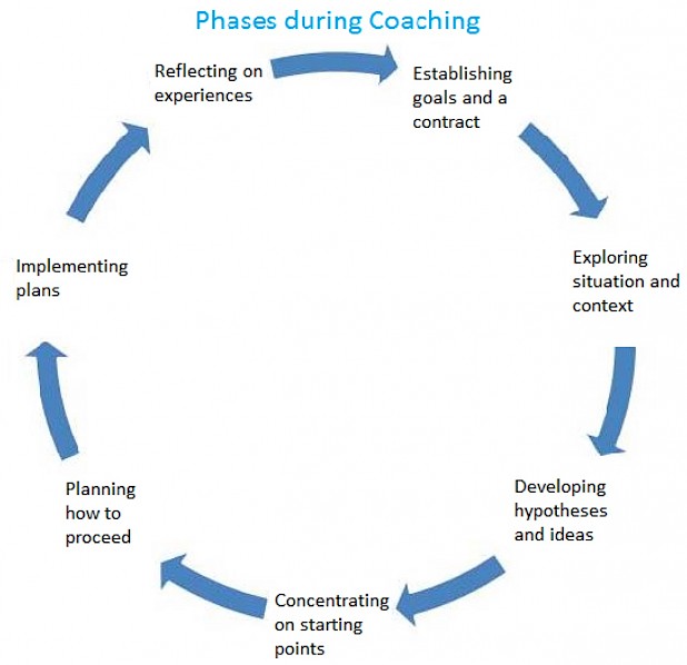 Coaching definitely is anything but a meticulously planned process, during which you mechanically run through predefined levels. Coaching is always a highly individual and specific activity, especially if you consider your coachee's individuality, his/her specific concern and all of the applied types of communication and processes: How often and how long you talk to each other? How many language levels or forms of language are particularly helpful? How much do you or your coachee contribute? How many questions do you generally ask? How much do you actually listen? How often and when do you you formulate ideas? How often and intensively do you talk about expectations and objectives? All of these questions and much more will be highly variable from coaching to coaching. But there are, nonetheless, distinct particular stages to any coaching process; at least as far as time, formality and contents are concerned.