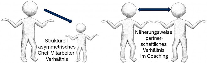 Coaching unterscheidet sich deutlich von der Art wie Chef und Mitarbeiter sich herkömmlicherweise begegnen. Rollenbedingt ist das Chef – Mitarbeiterverhältnis ein asymmetrisches Verhältnis. Der Chef gibt Ziele, Aufgaben, Beurteilungen; er verfügt über positive und negative Sanktionen in einer Weise, wie dies dem Mitarbeiter aus seiner Rolle heraus umgekehrt nicht möglich ist. Demgegenüber braucht Coaching ein gleichberechtigtes, partnerschaftliches Verhältnis. Im Coaching begegnen sich Coach und Coachee auf Augenhöhe. Und auch wenn dies bedingt durch die strukturelle Asymmetrie zwischen Chef und Mitarbeiter niemals zu 100% gelingen wird, so braucht es die gleiche Augenhöhe doch zumindest näherungsweise – so weit wie eben möglich.