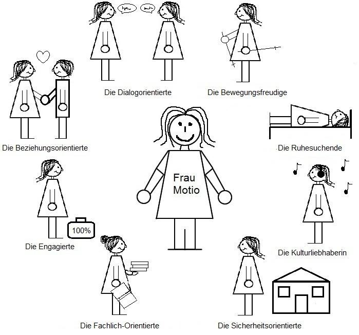 Frau Motio machte deutlich, dass einige ihrer inneren Teammitglieder in ihrem jetzigen beruflichen Umfeld systematisch zu kurz kämen und dass dies auch in den letzten Jahren immer schon so gewesen sei. So gäbe es zwar für die Engagierte schier unbegrenzte Einsatzmöglichkeiten und auch die Sicherheitsorientierte, die Dialogorientierte und die Beziehungsorientierte kämen auf ihre Kosten. Die Fachlich-Orientierte wäre aber schon nur eingeschränkt glücklich mit dem, was sie tue und die Kulturliebhaberin, die Ruhesuchende und die Bewegungsfreudige hätten viel zu oft das Nachsehen, was Frau Motio mehr und mehr unzufrieden mache.