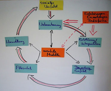 Wir nehmen etwas wahr, d.h. wir sehen, hören, spüren, riechen etwas. Diese Wahrnehmung ist selektiv, weil wir gar nicht imstande sind, alles das, was quasi im Angebot ist, mit unseren Sinnen aufzunehmen. Die wichtigsten Selektionsfilter sind neben unserem situativen Aufmerksamkeitsfokus unsere auf Erfahrungen basierenden Erwartungen. Zusätzlich beeinflussen unsere gerade drängendsten Bedürfnisse unsere Aufmerksamkeit und unsere Erklärungsmuster. Wir verleihen dem Wahrgenommenen automatisch einen Sinn, d.h. wir suchen nach einer für uns stimmigen und plausiblen Erklärung. Diese Erklärung („Nun wissen wir Bescheid“) basiert ebenfalls auf unseren Erfahrungen und Erwartungen sowie auf unserem Wissen. Das von uns so Verstandene bewerten wir im selben Moment – wir finden es z.B. gut oder schlecht, alarmierend oder beruhigend, spannend oder langweilig. Bewertungen sind immer mit Gefühlen verbunden und Gefühle mit Handlungsimpulsen. Wir verhalten uns entsprechend unserer Einschätzungen der Situation und unserer Schlussfolgerungen daraus. Dementsprechend ist das Echo aus unserer Umgebung häufig das Ergebnis einer selbsterfüllenden Prophezeiung. Anders ausgedrückt folgt unser Erleben und Verhalten der internen Logik unserer mentalen Modelle. Unser Horizont ist dadurch ziemlich klein. Wir verbleiben meist konsequent in unserem mentalen Schneckenhaus und bestätigen regelmäßig unsere eigenen Annahmen. Sie können auch sagen: Die Suppe, die wir mehr oder weniger gut gelaunt auslöffeln, haben wir uns zumindest teilweise selber eingebrockt.