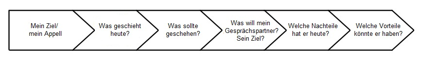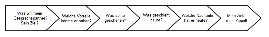 Es spricht nichts dagegen, dass man sich während der Gesprächsvorbereitung die Argumente so aufschreibt, wie sie einem in den Sinn kommen. Allerdings sollte man versuchen, auf ihre Reihenfolge im realen Gespräch zu achten. Das bedeutet, grundsätzlich mit dem Ziel von Herrn Vormüller zu beginnen und mit dem Appell, der für sein eigenes Ziel steht, zu enden. Im umgekehrten Fall würde Herr Vormüller deutlich stärker einen Aufforderungsdruck spüren, sich möglicherweise sogar angegriffen fühlen, und viel wahrscheinlicher in eine defensive, abwehrende Haltung geraten.