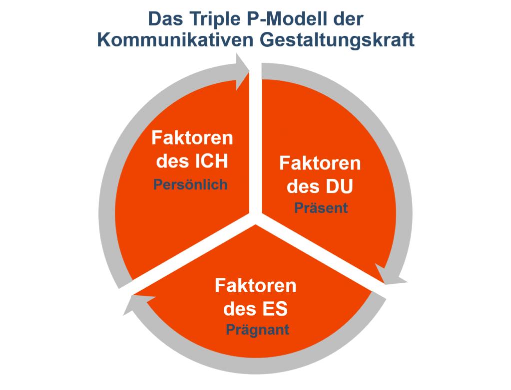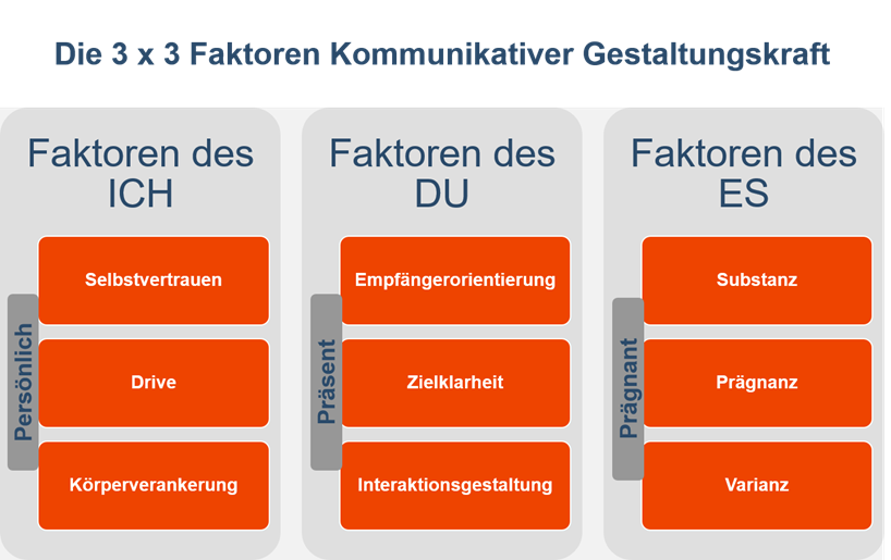 Geht man das Ganze etwas allgemeiner an, so kann man sagen: Kommunikative Gestaltungskraft resultiert maßgeblich aus dem Zusammenspiel von drei Arten von Faktoren: Faktoren des ICH, d.h. der Persönlichkeit, Faktoren des DU, d.h. der Präsenz in Bezug auf den jeweiligen Anderen und Faktoren des ES, d.h. der Prägnanz, Substanz und Varianz der ausgedrückten Inhalte.